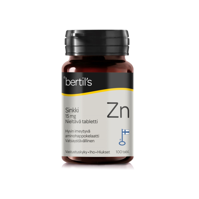 Kosttillskott som innehåller aminosyrakelaterad zink. Användningsändamål: Zink befrämjar motståndskraftens normala funktion och bidrar till att huden och håret hålls i normalt skick. Dosering: 1 tablett dagligen. Innehåll: Dygnsdosen 1 tabl. innehåller: 15 mg zink (150 % av rekommenderat dagligt intag). Förteckning över ingredienser: Fyllnadsämne cellulosapulver, maltodextrin, zinkbisglycinat 22 % (USA), majsstärkelse, emulgeringsmedel E470b. Bör observeras: Förvaras utom räckhåll för barn. Kosttillskott ersätter inte en varierad kost. Dosering enligt anvisningarna får inte överskridas. Tillverkad i Finland. Graviditet och amning: Lämplig för blivande och ammande mödrar. Förvaring: Förvara produkten vid rumstemperatur, bort från fukt och ljus.